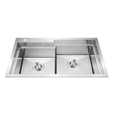 圆边角设计,子母盆设计,收缩空间要求,减少厨房用具对台面空间的占用, 并且左大右小,用起来更加顺手方便