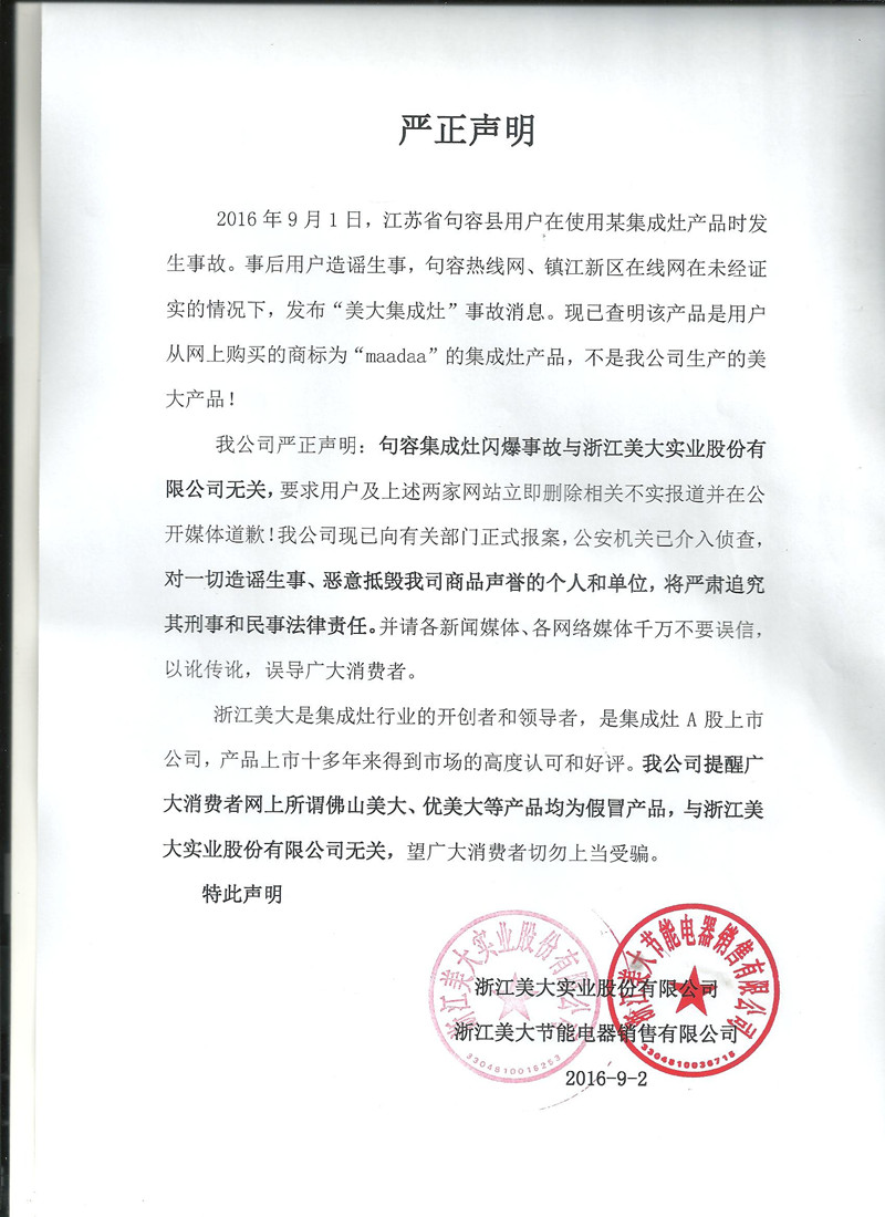 2016年9月1日,江苏省句容县用户在使用某集成灶产品时发生事故。事后用户造谣生事,句容热线网、镇江新区在线网在未经证实的情况下,发布“美大集成灶”事故消息。现已查明该产品是用户从网上购买的商标为“maadaa”的集成灶产品,不是我公司生产的美大产品!